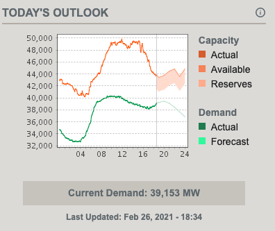 Once the crisis began, it was hard to explain to Sam what was happening. We had little official information to go on. For example, I couldn’t tell him when we might be able to depend on having power again, because no one was saying. I showed him the homepage for the state’s power grid, which has a good visual for what’s happening at the moment. On the outage days, there were bizarre spikes in future capacity, as if ERCOT expected four or five generation facilities to come back online at any moment.